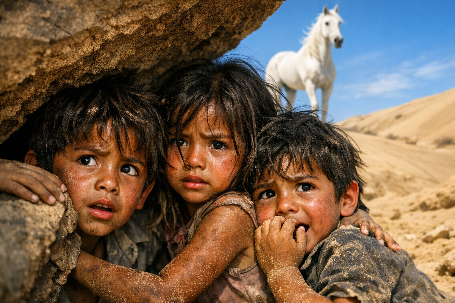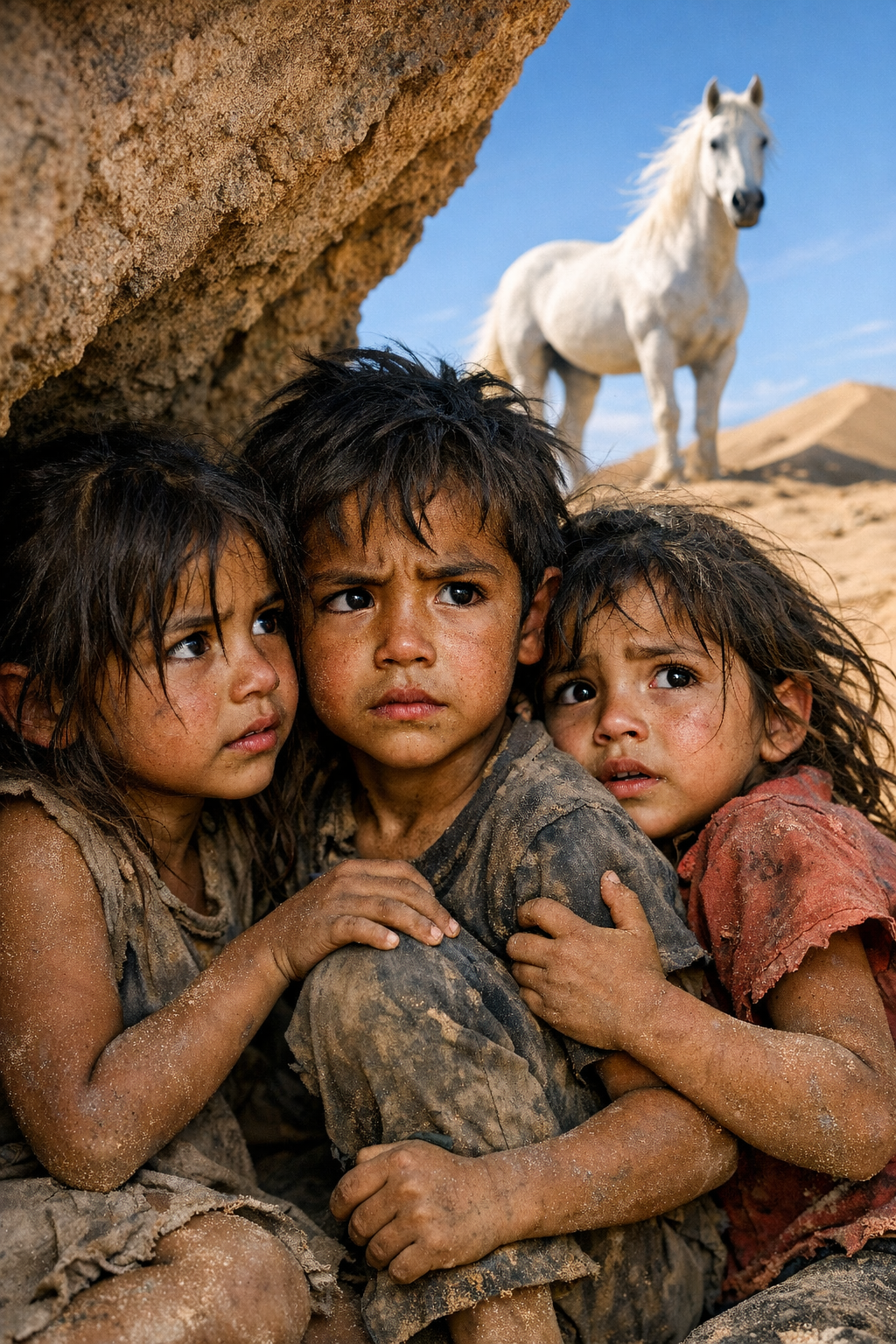 Desde lo alto de una duna, recortado contra el cielo intensamente azul, se distinguía la silueta de un caballo blanco. Su pelaje claro relucía bajo la luz brutal del mediodía y la crin se mecía con la brisa ardiente. No tenía el aspecto arisco de un animal salvaje cualquiera; su postura era firme, casi majestuosa, y en sus ojos oscuros brillaba algo que parecía comprensión. Había presenciado todo: la llegada del vehículo, el abandono despiadado, la huida sin mirar atrás. Fue testigo silencioso de la traición. Y ahora mantenía la mirada fija en los niños con una atención que iba más allá de la simple curiosidad animal.