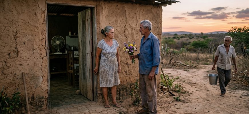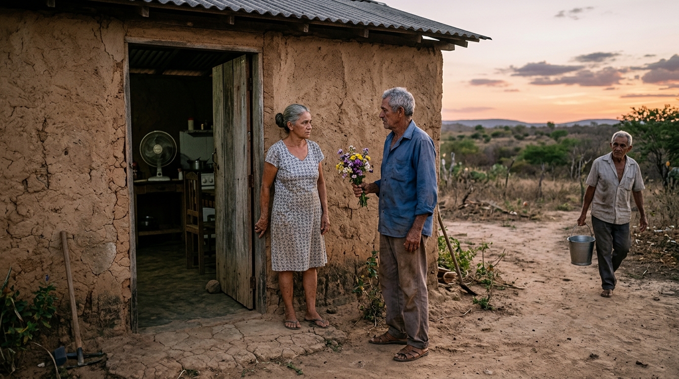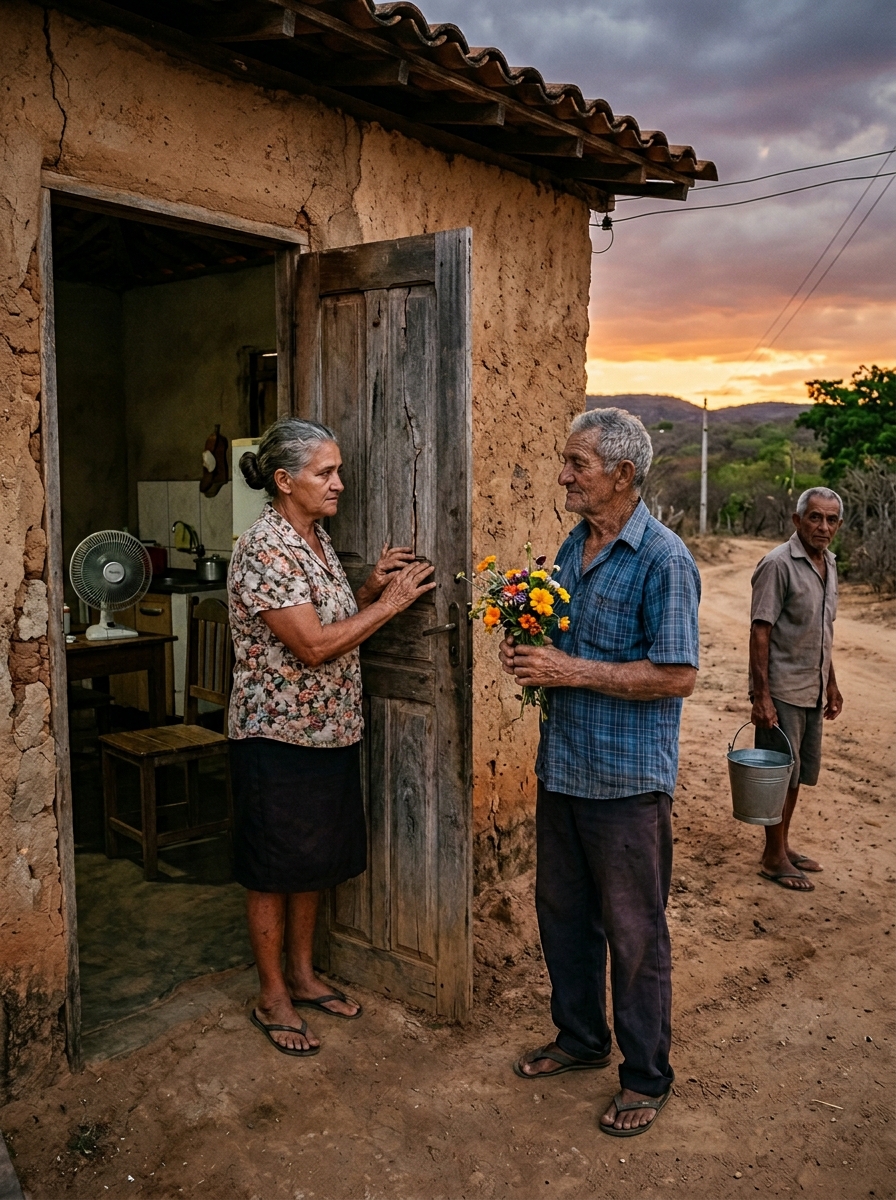 Descendió con un ramo de flores que había comprado por impulso en un puesto del camino. Apenas puso un pie en el suelo, se sintió absurdo. ¿Un ramo? ¿Después de nueve años de silencio? Una ráfaga del sertón le arrancó un pétalo y lo arrojó al polvo, como si la tierra misma se burlara de él. Tragó saliva y golpeó la puerta con los nudillos.